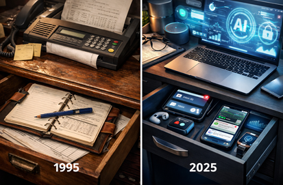 Año 1995. Llegas a la oficina, abres el cajón y aparece el kit de supervivencia: agenda de anillas, tarifas impresas, boli Bic mordido (porque pensar desgasta) y un fax...